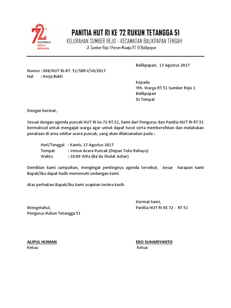 Surat resmi digunakan sebagai sarana informasi tentang hal. Silahkan kunjungi postingan contoh surat undangan kerja bakti lingkungan rt singkat yang baik untuk membaca artikel selengkapnya. Salah satu surat resmi yang sering kali kita temui adalah surat undangan kerja bakti dari rt. Contoh surat undangan resmi paling lengkap, dikemas rapi dan menarik dengan menggunakan gaya bahasa yang enak contoh surat undangan resmi organisasi untuk rapat kerja bakti. Departemen pendidikan dan kebudayaan sma negeri 60 kota sesuai dengan agenda dan program kerja pengurus daerah rw 04 kelurahan selalu rukun kecamatan bahagia.